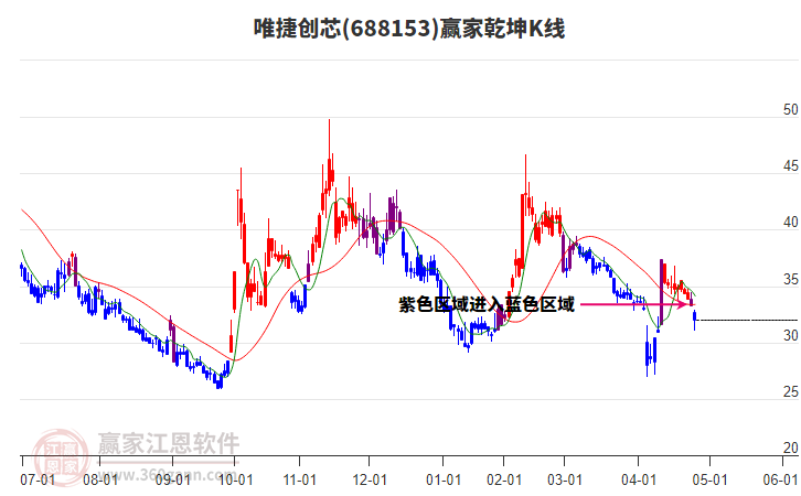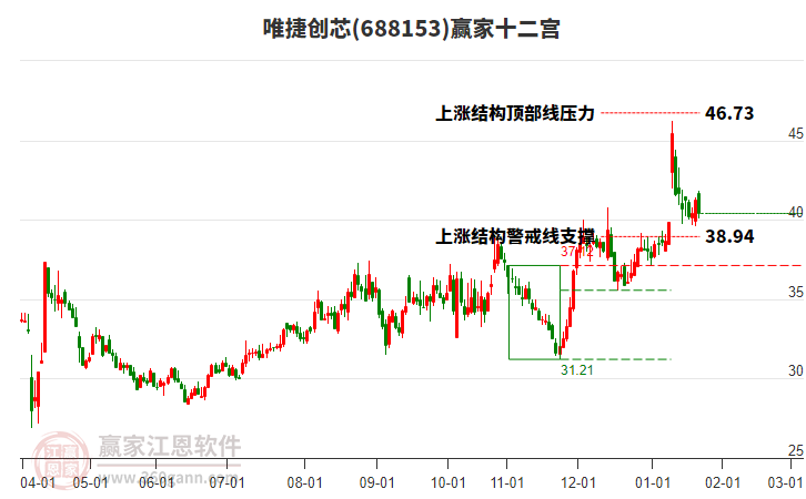 依據(jù)贏家江恩系統(tǒng)趨勢工具極反通道分析判斷唯捷創(chuàng)芯688153運行在生命線以下弱勢區(qū)域,根據(jù)規(guī)則該股短線輕倉參與,股價跌至弱勢外軌線后波段再結(jié)合其它工具信號建倉。應(yīng)用口訣是:生命線上強勢走,生命線下難抬頭;紅黃兩條外軌線,壓力支撐顯勢頭。