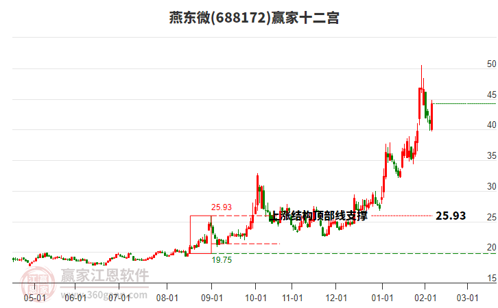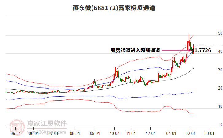 依據(jù)贏家江恩系統(tǒng)趨勢工具極反通道分析判斷燕東微688172運行在生命線以下弱勢區(qū)域,根據(jù)規(guī)則該股短線輕倉參與,股價跌至弱勢外軌線后波段再結合其它工具信號建倉。應用口訣是:生命線上強勢走,生命線下難抬頭;紅黃兩條外軌線,壓力支撐顯勢頭。
