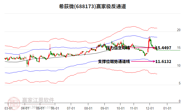 依據(jù)贏家江恩系統(tǒng)趨勢(shì)工具極反通道分析判斷希荻微688173運(yùn)行在生命線以下弱勢(shì)區(qū)域,根據(jù)規(guī)則該股短線輕倉(cāng)參與,股價(jià)跌至弱勢(shì)外軌線后波段再結(jié)合其它工具信號(hào)建倉(cāng)。應(yīng)用口訣是:生命線上強(qiáng)勢(shì)走,生命線下難抬頭;紅黃兩條外軌線,壓力支撐顯勢(shì)頭。