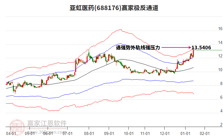 今天688176亞虹醫(yī)藥最高價13.57挑戰(zhàn)了贏家極反通道工具上方紅色外軌線,受到上方紅色外軌線強(qiáng)力壓制,最終收盤停留在在上方紅色外軌線與藍(lán)色外軌線上方的超強(qiáng)通道區(qū)域。688176亞虹醫(yī)藥近10個交易