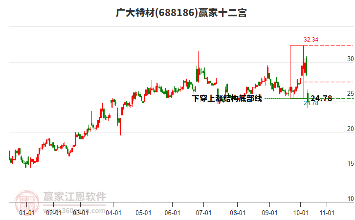 688186廣大特材處于贏家江恩空頭主線形態(tài),從1月26日形成頂分型后持續(xù)下跌,今日形成短期初次筑頂信號(hào),短期多頭趨勢(shì)已被破壞,中期多頭反彈趨勢(shì)延續(xù),但長(zhǎng)期處于下跌中。廣大特材今日跳空低開,截止目前K