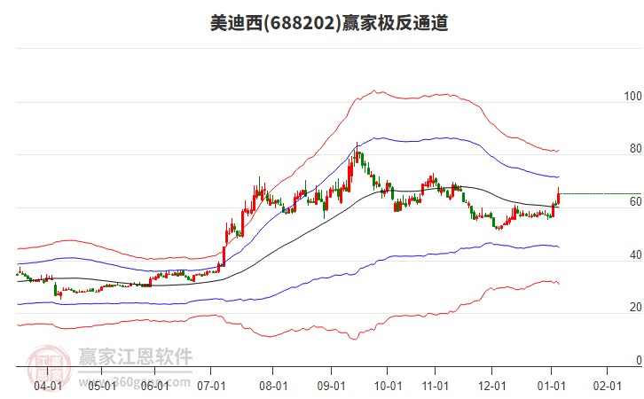 1月9日美迪西688202最高價71.99挑戰(zhàn)了贏家極反通道工具藍色外軌線,受到藍色外軌線強力壓制,最終收盤停留在在藍色外軌線與生命線上方的強勢通道區(qū)域。美迪西688202近10個交易日漲幅23.97