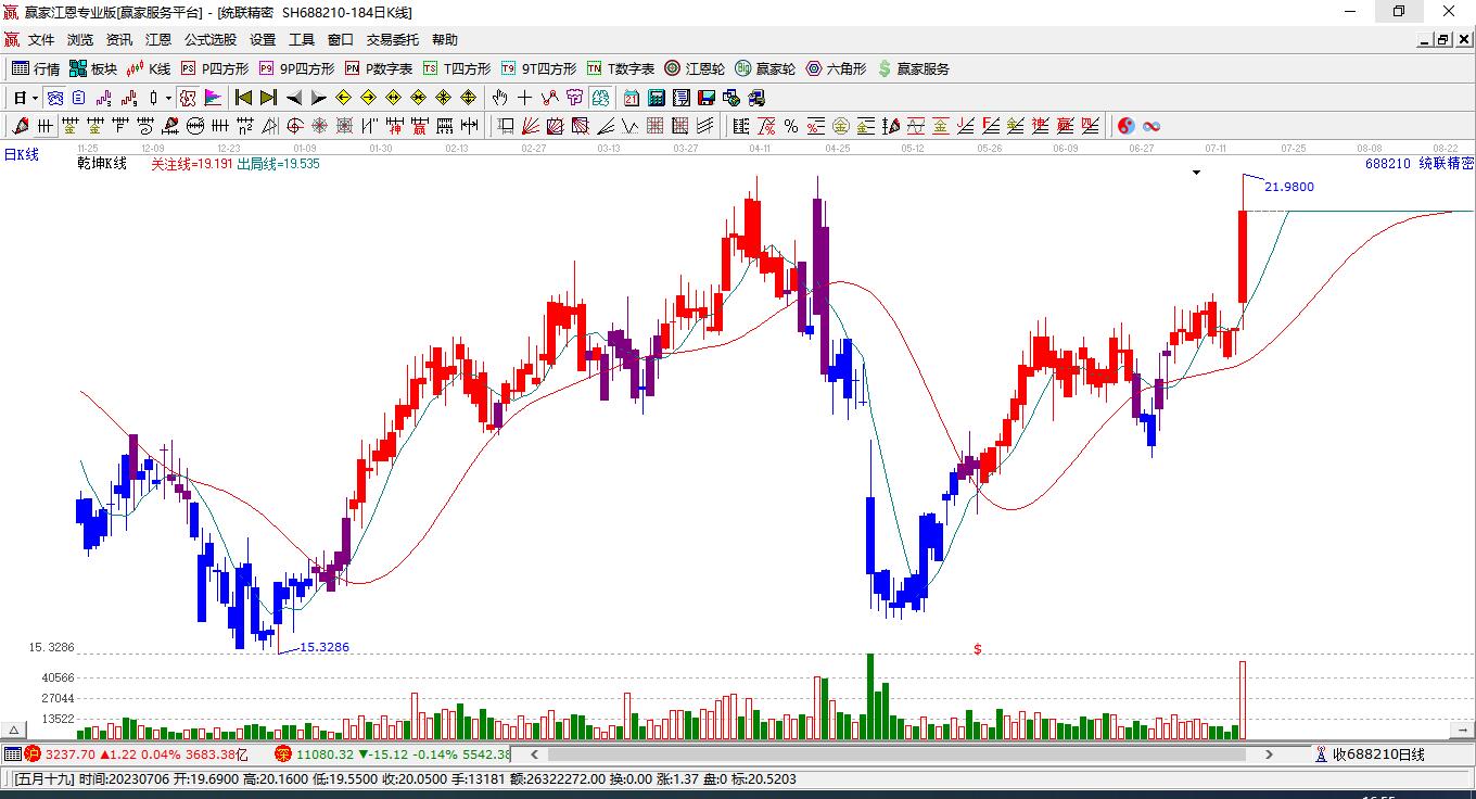688210統(tǒng)聯(lián)精密處于贏家江恩多頭主線形態(tài),從1月14日形成底分型后持續(xù)上攻,今日突破前高形成初次江恩筑底信號,中長期多頭趨勢依舊保持。統(tǒng)聯(lián)精密今日跳空低開,截止目前K線為上影小陽線,但卻是個假陽線