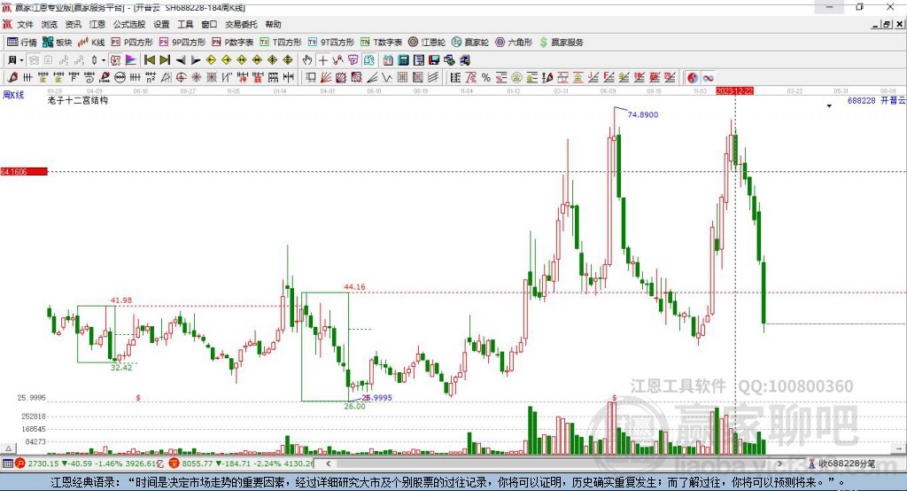 688228開普云處于贏家江恩多頭次主線形態(tài),12月8日發(fā)出江恩筑底信號后,經(jīng)過38日,今日形成短期筑頂信號,短期多頭趨勢已被破壞,中長期多頭趨勢依舊保持。688228開普云根據(jù)贏家江恩極反通道趨勢工