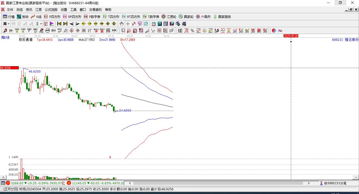 依據(jù)贏家江恩極反通道趨勢工具展示,該股于2025年2月21日突破站穩(wěn)生命線,展開一波上攻,至本周持續(xù)51周,本周股價上穿強勢通道線30.0977,由強勢通道進入超強通道,依據(jù)贏家江恩極反通道規(guī)則,站穩(wěn)一線看高一線。若能有效站穩(wěn)強勢通道線,則有望持續(xù)上攻至強勢外軌線附近,若不能站穩(wěn)強勢通道線,將繼續(xù)在強勢通道運行。