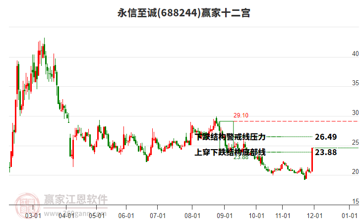 12月10日688244永信至誠最高價25.38上穿了贏家極反通道工具藍(lán)色外軌線,受到藍(lán)色外軌線強力壓制,最終收盤停留在在藍(lán)色外軌線與生命線上方的強勢通道區(qū)域。688244永信至誠近10個交易日漲幅2