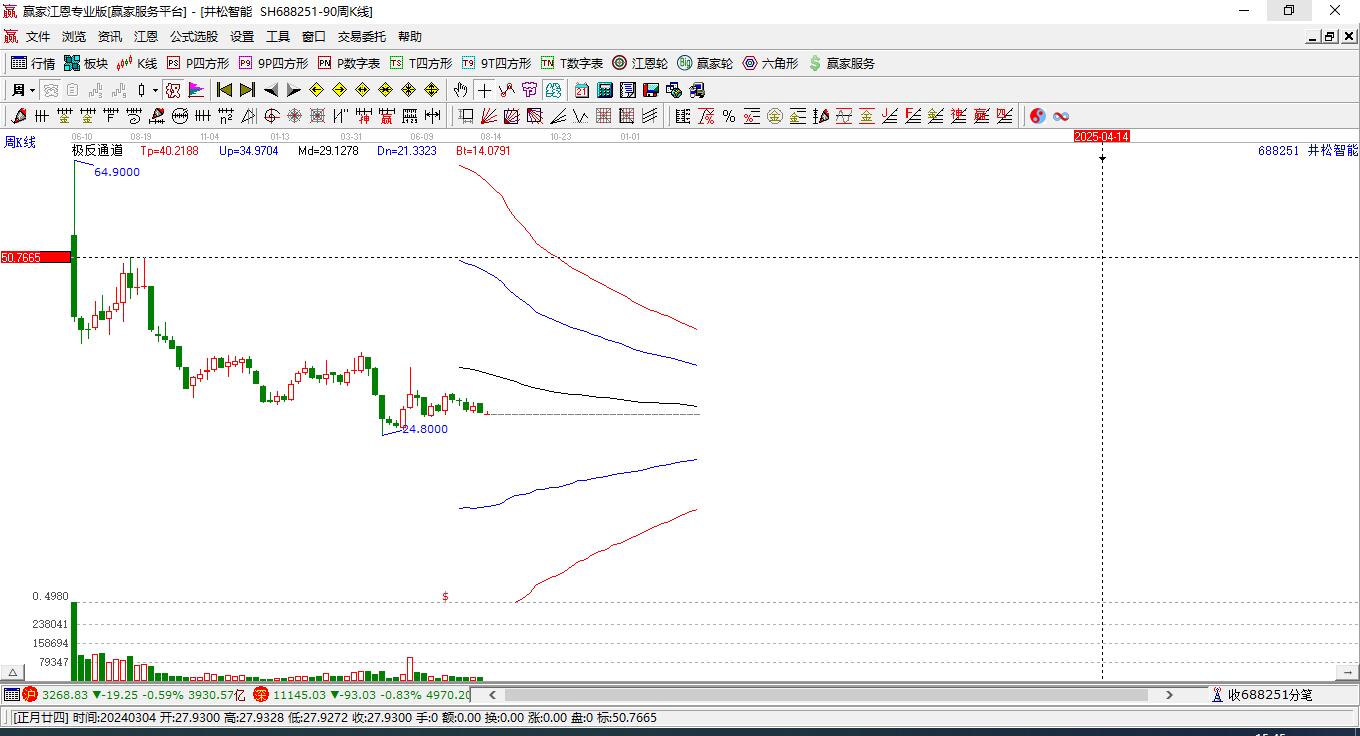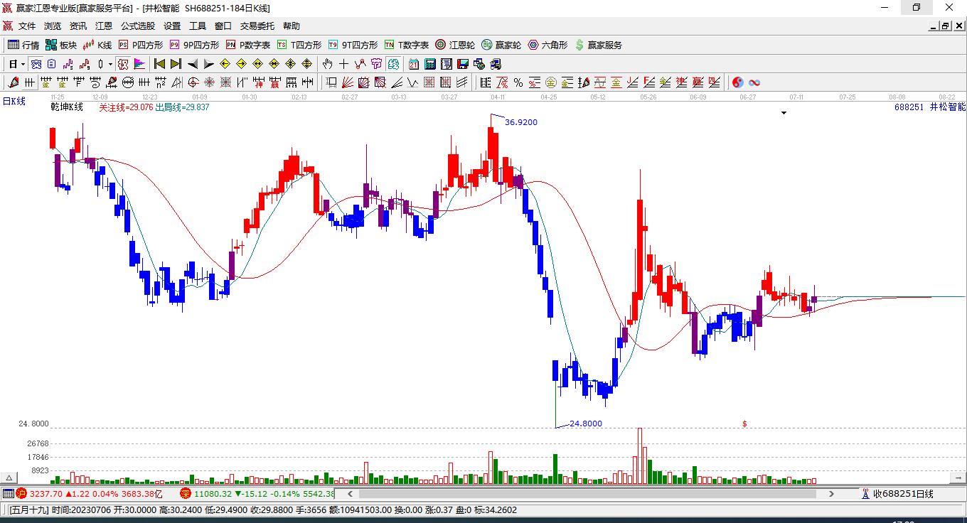 688251井松智能處于贏家江恩多頭中期回調(diào)形態(tài),12月25日發(fā)出江恩筑頂信號后,經(jīng)過5日,今日再次發(fā)出江恩底分型并發(fā)出江恩筑底信號,中期雖然處于下跌中,但長期多頭趨勢延續(xù)。井松智能今日雖高開,截止目