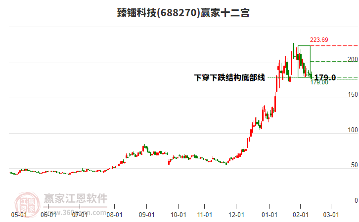 2月13日股價處于2026年2月12日形成的下跌結構底部線174.4上方區(qū)域,該股自近期高點228.0跌至今日175.28,跌幅30.08%。依據(jù)贏家十二宮多空能量守恒規(guī)則,若股價不能有效站穩(wěn)底部線,下方多空能量平衡位需結合前方贏家十二宮結構尋找。