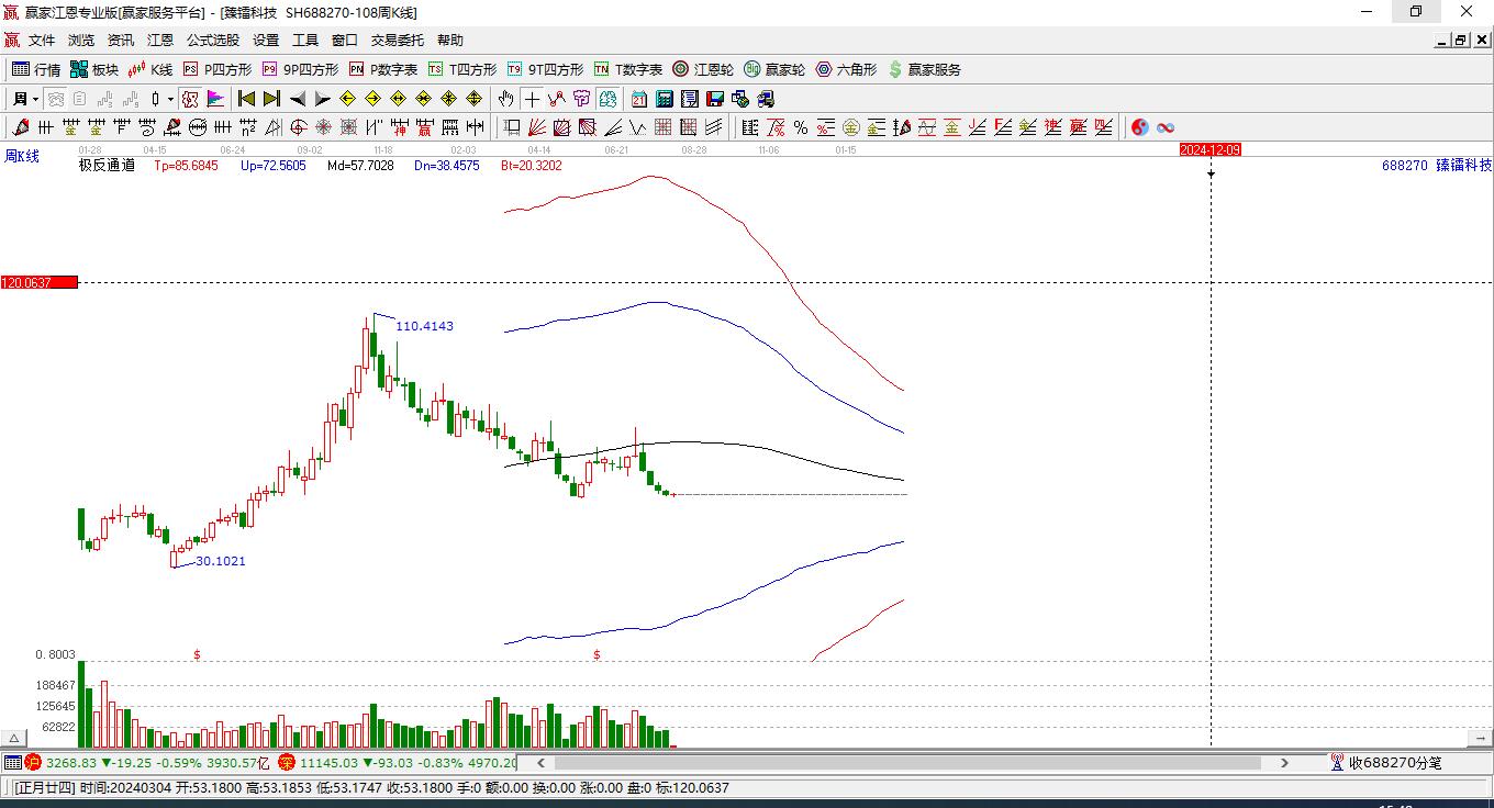 依據(jù)贏家江恩極反通道趨勢(shì)工具展示,本周股價(jià)自極反通道極強(qiáng)區(qū)域跌落至超強(qiáng)通道,近期周線波段高點(diǎn)為1月30日,至本周跌幅30.08%,極反通道規(guī)則顯示,失守一線,看低一線,本周股價(jià)如不能再次收復(fù)強(qiáng)勢(shì)外軌線,則向下至強(qiáng)勢(shì)通道線位置附近尋找新的支撐。