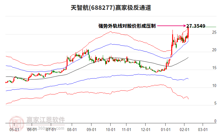2月6日天智航最高價(jià)27.6挑戰(zhàn)了贏家極反通道工具上方紅色外軌線,受到上方紅色外軌線強(qiáng)力壓制,最終收盤停留在在上方紅色外軌線與藍(lán)色外軌線上方的超強(qiáng)通道區(qū)域。天智航近10個(gè)交易日漲幅12.76%。