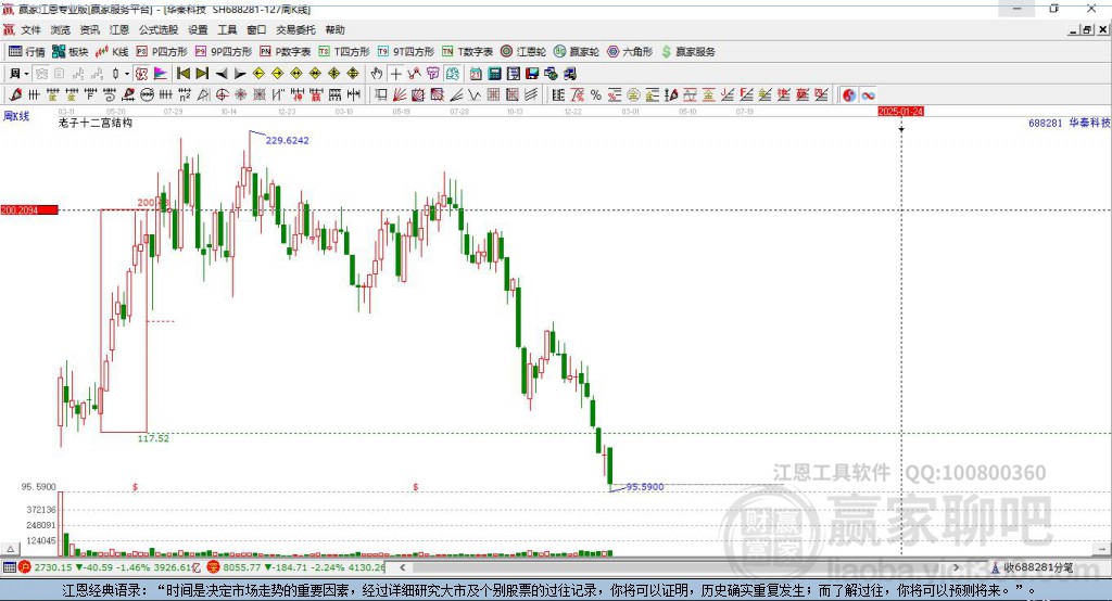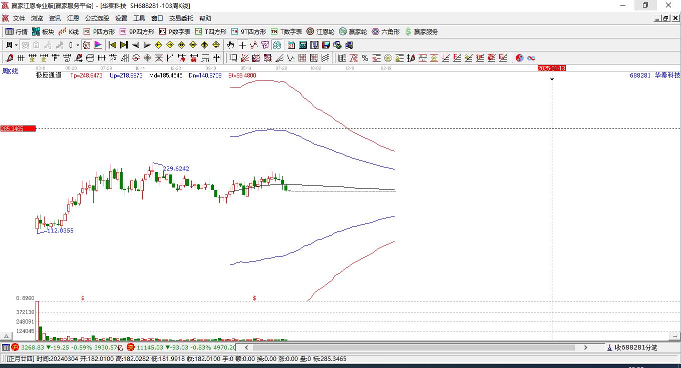 華秦科技(688281)處于贏家江恩多頭次主線形態(tài),12月12日發(fā)出江恩筑底信號后,經(jīng)過56日,今日形成短期筑頂信號,短期多頭趨勢已被破壞,中長期多頭趨勢依舊保持。華秦科技今日跳空低開,目前K線呈現(xiàn)上