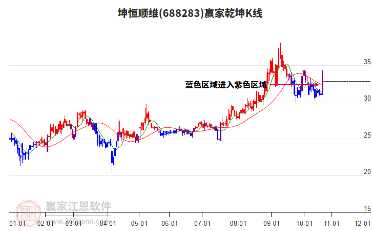 1月16日688283坤恒順維挑戰(zhàn)藍(lán)色外軌線 以上影中陽線收盤