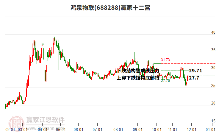 2月13日股價上穿前期2025年10月15日形成的下跌結(jié)構(gòu)警戒線29.71,本輪上漲自前期低點2月2日,經(jīng)歷9日漲至今日30.4,漲幅16.83%。依據(jù)贏家十二宮多空能量守恒規(guī)則,下跌結(jié)構(gòu)警戒線是多空能量平衡點,突破或跌破往往意味著平衡打破。 今日突破警戒線,多方能量主導(dǎo)上攻,有望在下跌結(jié)構(gòu)頂部線31.73附近將會形成新的多空能量平衡位。