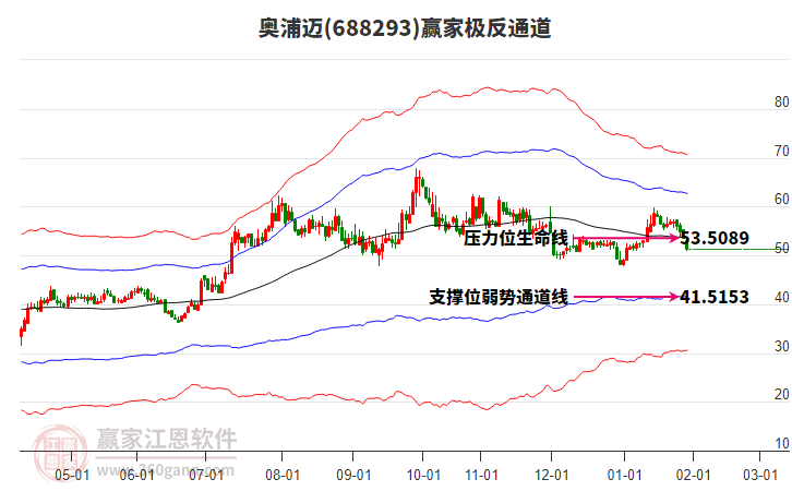 依據(jù)贏家江恩系統(tǒng)趨勢(shì)工具極反通道分析判斷奧浦邁688293運(yùn)行在生命線以下弱勢(shì)區(qū)域,根據(jù)規(guī)則該股短線輕倉(cāng)參與,股價(jià)跌至弱勢(shì)外軌線后波段再結(jié)合其它工具信號(hào)建倉(cāng)。應(yīng)用口訣是:生命線上強(qiáng)勢(shì)走,生命線下難抬頭;紅黃兩條外軌線,壓力支撐顯勢(shì)頭。