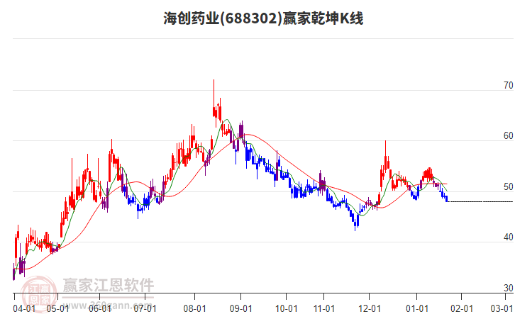 688302海創(chuàng)藥業(yè)處于贏家江恩多頭中期回調(diào)形態(tài),從1月12日形成頂分型后持續(xù)下跌,重心下移,今日跌破前低形成短期初次筑頂信號,短期多頭趨勢已被破壞,中長線均在空頭下跌趨勢中。海創(chuàng)藥業(yè)今日低開后持續(xù)下