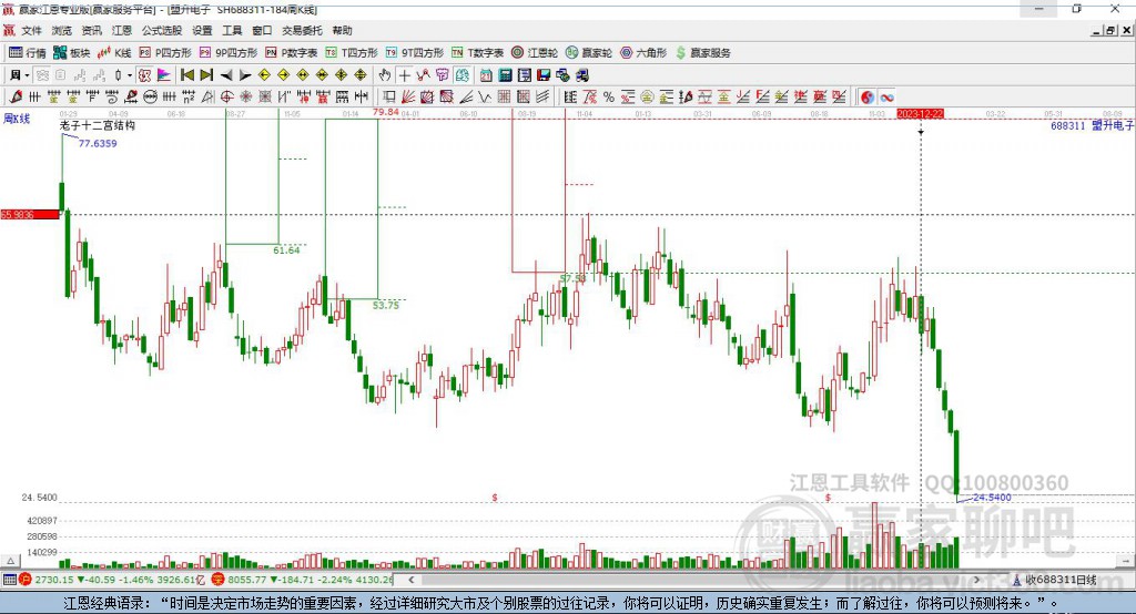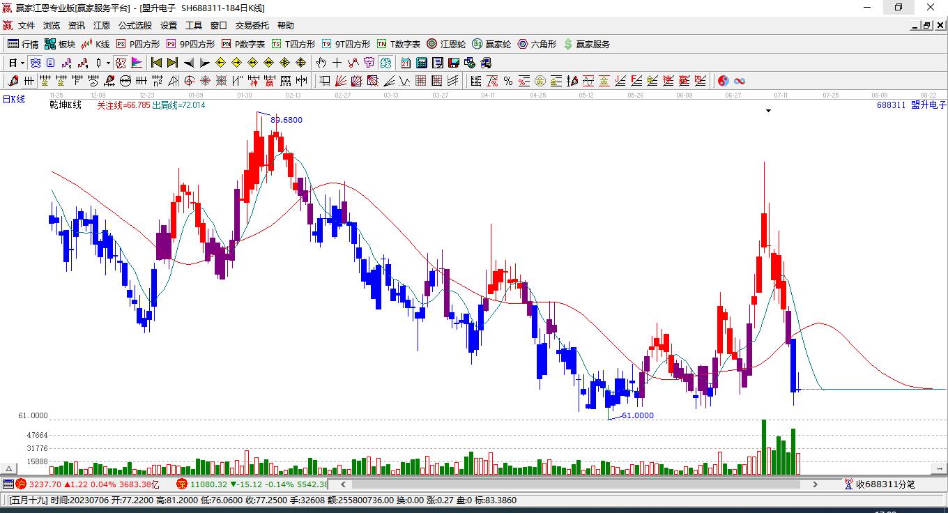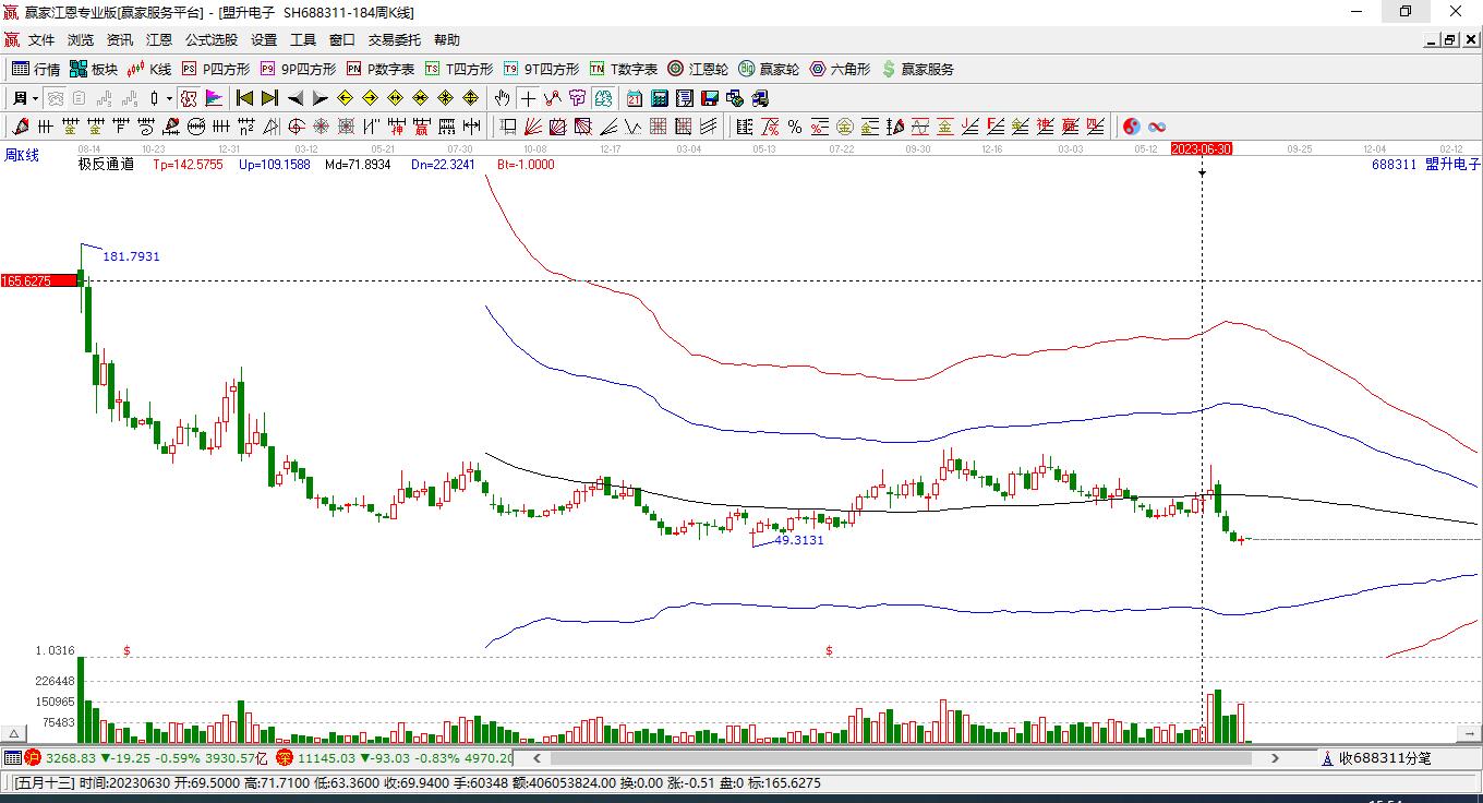今天688311盟升電子最高價52.28上穿了贏家極反通道工具上方紅色外軌線,受到上方紅色外軌線強力壓制,最終收盤停留在在上方紅色外軌線與藍色外軌線上方的超強通道區(qū)域。688311盟升電子近10個交易
