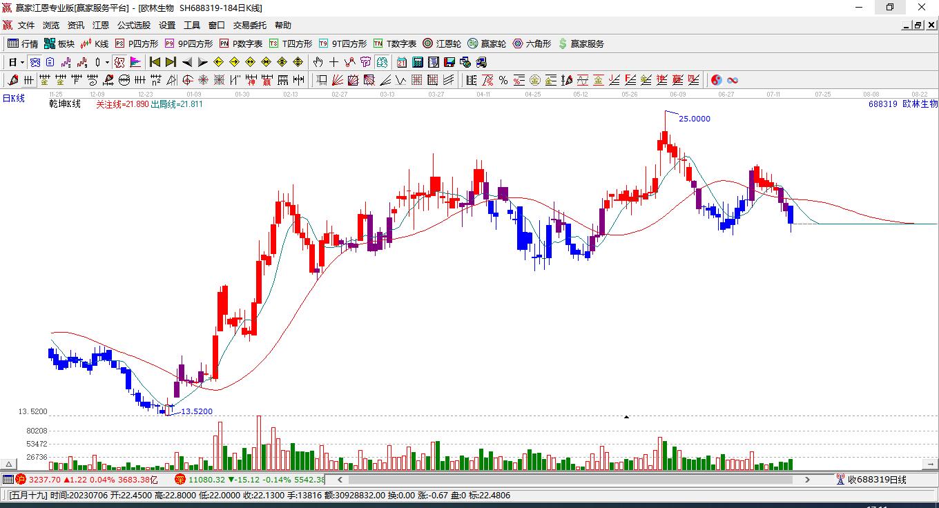 歐林生物處于贏家江恩多頭中期回調形態(tài),12月25日發(fā)出江恩筑頂信號后,經過6日,今日再次發(fā)出江恩底分型并發(fā)出江恩筑底信號,中長線均在空頭下跌趨勢中。歐林生物今日低開,截止目前股價高于昨日收盤價,形成反
