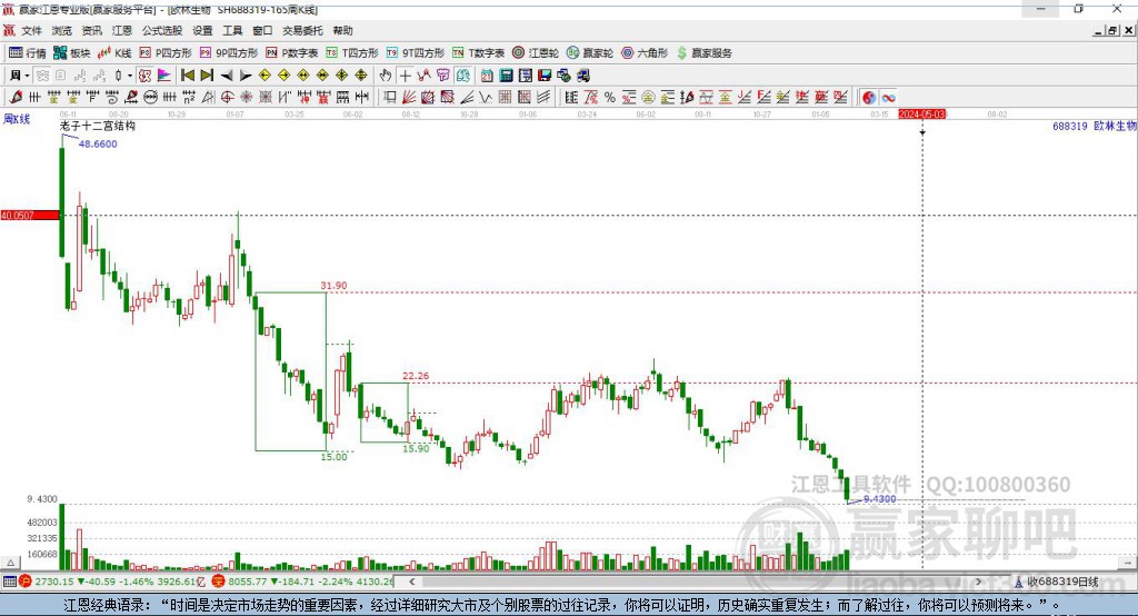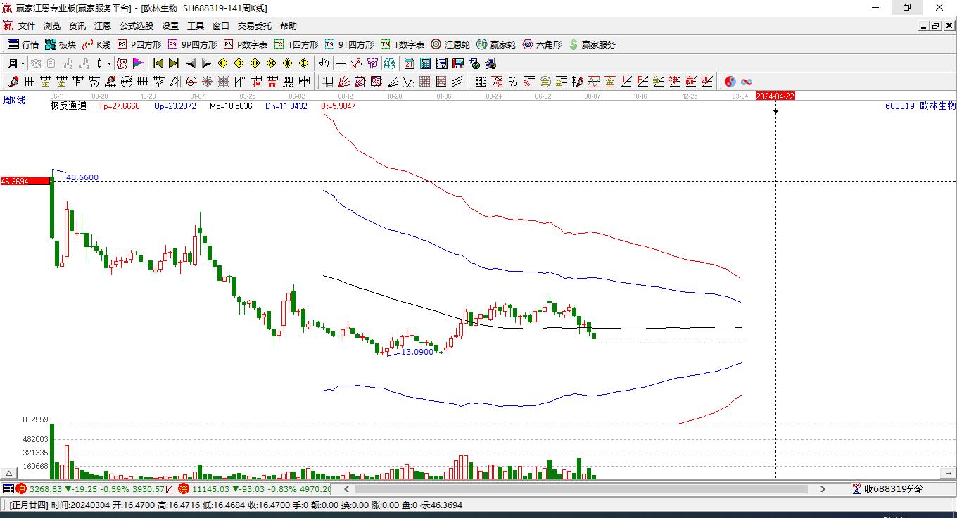 688319歐林生物處于贏家江恩多頭中期回調形態(tài),9月30日發(fā)出江恩筑底信號后,經過86日,今日形成短期筑頂信號,短期多頭趨勢已被破壞,中長線均在空頭下跌趨勢中。歐林生物今日雖高開,截止目前股價低于昨