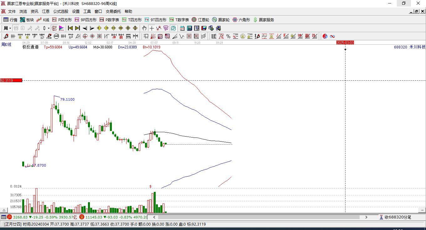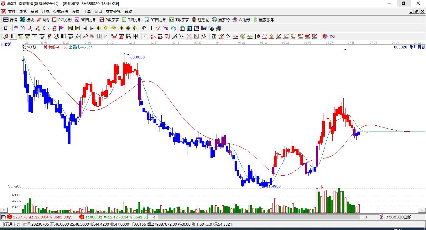688320禾川科技處于贏家江恩空頭主線形態(tài),從1月26日形成頂分型后持續(xù)下跌,今日形成短期初次筑頂信號,短期多頭趨勢已被破壞,中期多頭反彈趨勢延續(xù),但長期處于下跌中。禾川科技今日跳空低開,截止目前K