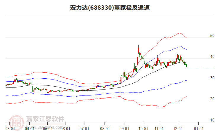 依據(jù)贏家江恩系統(tǒng)趨勢(shì)工具極反通道分析判斷宏力達(dá)688330運(yùn)行在生命線以下弱勢(shì)區(qū)域,根據(jù)規(guī)則該股短線輕倉參與,股價(jià)跌至弱勢(shì)外軌線后波段再結(jié)合其它工具信號(hào)建倉。應(yīng)用口訣是:生命線上強(qiáng)勢(shì)走,生命線下難抬頭;紅黃兩條外軌線,壓力支撐顯勢(shì)頭。