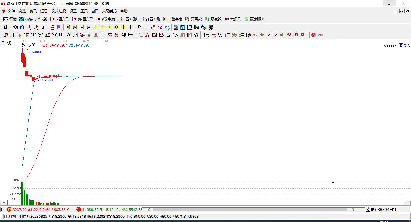 西高院處于贏家江恩多頭主線形態(tài),從12月17日形成底分型后持續(xù)上攻,今日突破前高形成初次江恩筑底信號,中長期多頭趨勢依舊保持。西高院今日跳空高開,截止目前K線下影小陽線,上漲能量較為強勢。