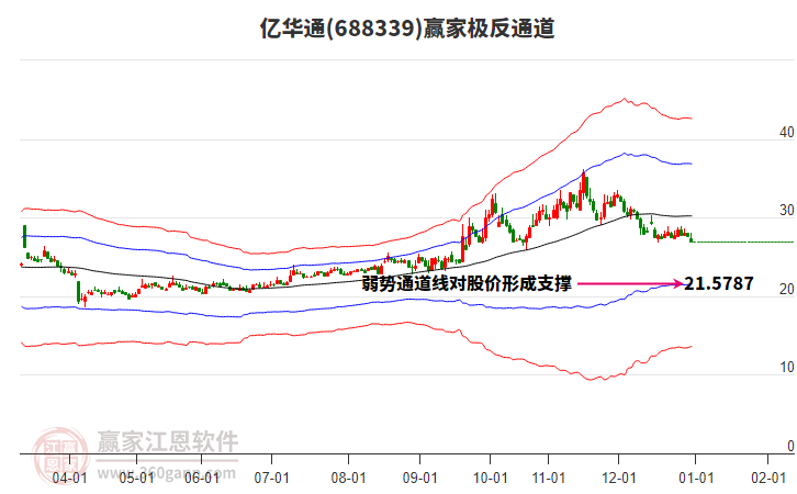 依據(jù)贏家江恩系統(tǒng)趨勢工具極反通道分析判斷億華通688339運(yùn)行在生命線以下弱勢區(qū)域,根據(jù)規(guī)則該股短線輕倉參與,股價跌至弱勢外軌線后波段再結(jié)合其它工具信號建倉。應(yīng)用口訣是:生命線上強(qiáng)勢走,生命線下難抬頭;紅黃兩條外軌線,壓力支撐顯勢頭。