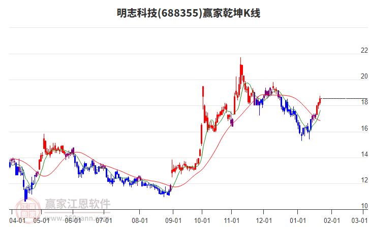 明志科技處于贏家江恩多頭中期回調(diào)形態(tài),從12月17日形成底分型后持續(xù)上攻,今日突破前高形成初次江恩筑底信號(hào),中期多頭反彈趨勢(shì)延續(xù),但長期處于回調(diào)中。明志科技今日跳空高開,截止目前K線上下影中陽線,上漲