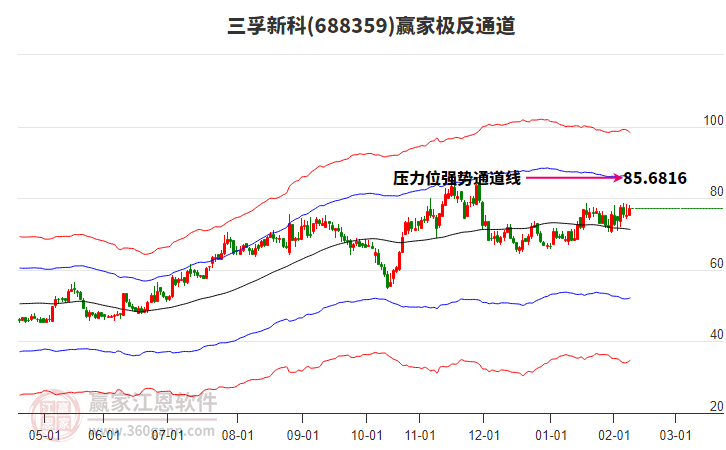 目前三孚新科688359最高價84.8挑戰(zhàn)了贏家極反通道工具藍色外軌線,受到藍色外軌線強力壓制,最終收盤停留在在藍色外軌線與生命線上方的強勢通道區(qū)域。三孚新科688359近10個交易日漲幅12.95%