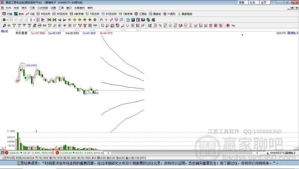 688375國(guó)博電子處于贏(yíng)家江恩多頭次主線(xiàn)形態(tài),12月11日發(fā)出江恩筑底信號(hào)后,經(jīng)過(guò)48日,今日形成短期筑頂信號(hào),短期多頭趨勢(shì)已被破壞,中長(zhǎng)期多頭趨勢(shì)依舊保持。國(guó)博電子今日雖高開(kāi),截止目前股價(jià)低于昨日