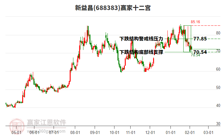 依據(jù)贏家江恩系統(tǒng)趨勢工具極反通道分析判斷新益昌688383運(yùn)行在生命線以下弱勢區(qū)域,根據(jù)規(guī)則該股短線輕倉參與,股價跌至弱勢外軌線后波段再結(jié)合其它工具信號建倉。應(yīng)用口訣是:生命線上強(qiáng)勢走,生命線下難抬頭;紅黃兩條外軌線,壓力支撐顯勢頭。