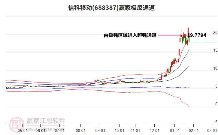 依據贏家江恩系統(tǒng)趨勢工具極反通道分析判斷信科移動688387運行在生命線以下弱勢區(qū)域,根據規(guī)則該股短線輕倉參與,股價跌至弱勢外軌線后波段再結合其它工具信號建倉。應用口訣是:生命線上強勢走,生命線下難抬頭;紅黃兩條外軌線,壓力支撐顯勢頭。