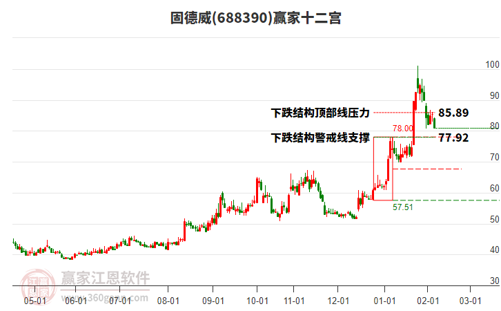 2月13日股價(jià)下穿2026年2月10日形成的下跌結(jié)構(gòu)底部線78.0,今日小幅下跌3.95%,自近期高點(diǎn)1月26日100.99持續(xù)下跌至今日76.76,共下跌24.23元,跌幅31.57%。依據(jù)贏家十二宮多空能量守恒規(guī)則,當(dāng)前股價(jià)若能及時(shí)收復(fù)并站穩(wěn)底部線78.0,則方向有望由多方能量主導(dǎo),上方多空能量平衡位關(guān)注警戒線86.27;若股價(jià)持續(xù)下跌,下方多空能量平衡位需結(jié)合前方贏家十二宮結(jié)構(gòu)尋找。