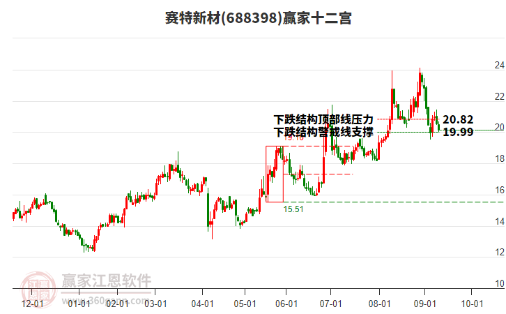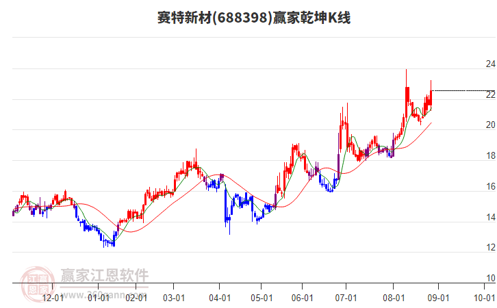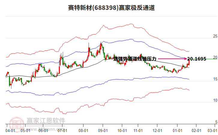 今日688398賽特新材最高價25.15上穿了贏家極反通道工具上方紅色外軌線,受到上方紅色外軌線強力壓制,最終收盤停留在在上方紅色外軌線與藍色外軌線上方的超強通道區(qū)域。688398賽特新材近10個交易