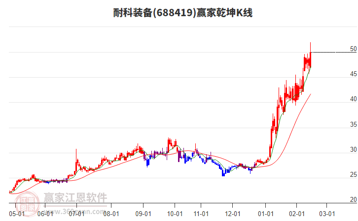 2月9日耐科裝備688419挑戰(zhàn)上方紅色外軌線 以光腳小陽線收盤