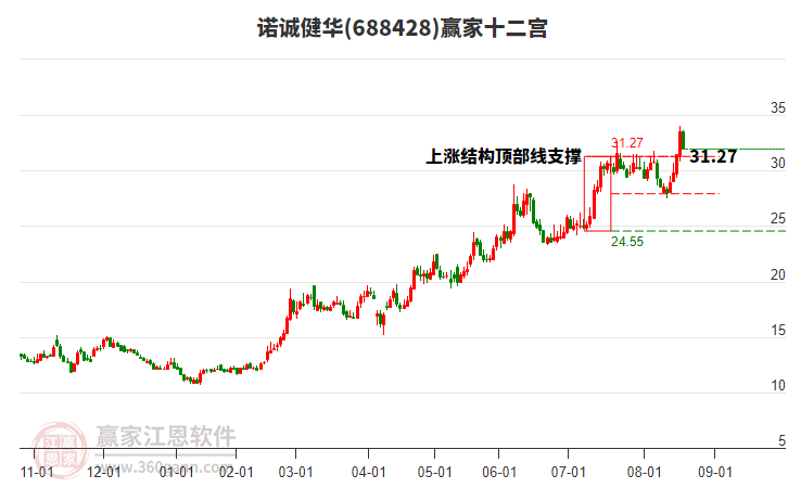 依據(jù)贏家江恩系統(tǒng)趨勢工具極反通道分析判斷諾誠健華688428運(yùn)行在生命線以下弱勢區(qū)域,根據(jù)規(guī)則該股短線輕倉參與,股價(jià)跌至弱勢外軌線后波段再結(jié)合其它工具信號(hào)建倉。應(yīng)用口訣是:生命線上強(qiáng)勢走,生命線下難抬頭;紅黃兩條外軌線,壓力支撐顯勢頭。