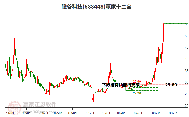 磁谷科技(688448)處于贏家江恩多頭中期回調(diào)形態(tài),今日重心上移,形成底分型,5月9日發(fā)出中期江恩筑底信號(hào)后,經(jīng)過(guò)213日,今日形成中期筑頂信號(hào),若持續(xù)下跌,觸發(fā)長(zhǎng)期筑頂信號(hào),磁谷科技(688448