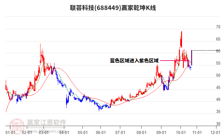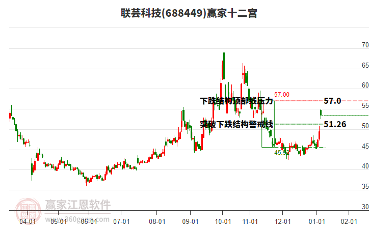 1月30日688449聯(lián)蕓科技最高價57.8挑戰(zhàn)了贏家極反通道工具藍(lán)色外軌線,受到藍(lán)色外軌線強(qiáng)力壓制,最終收盤停留在在藍(lán)色外軌線與生命線上方的強(qiáng)勢通道區(qū)域。688449聯(lián)蕓科技近10個交易日漲幅3.2