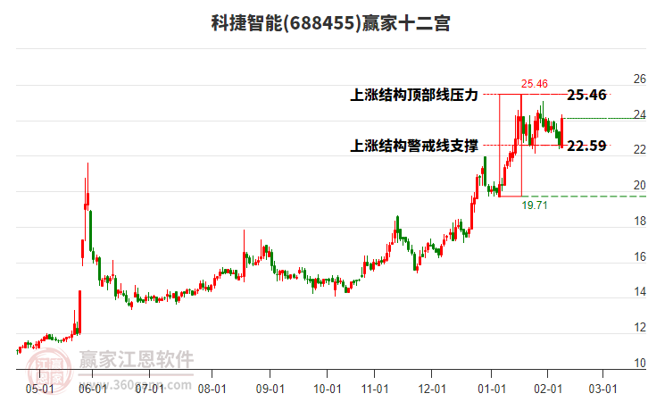 科捷智能(688455)處于贏家江恩多頭主線形態(tài),2月2日發(fā)出江恩筑頂信號(hào)后,經(jīng)過(guò)7日,今日再次發(fā)出江恩底分型并發(fā)出江恩筑底信號(hào),中期雖然處于回調(diào)中,但長(zhǎng)期多頭趨勢(shì)延續(xù)??平葜悄苣壳岸囝^又再次反擊,小