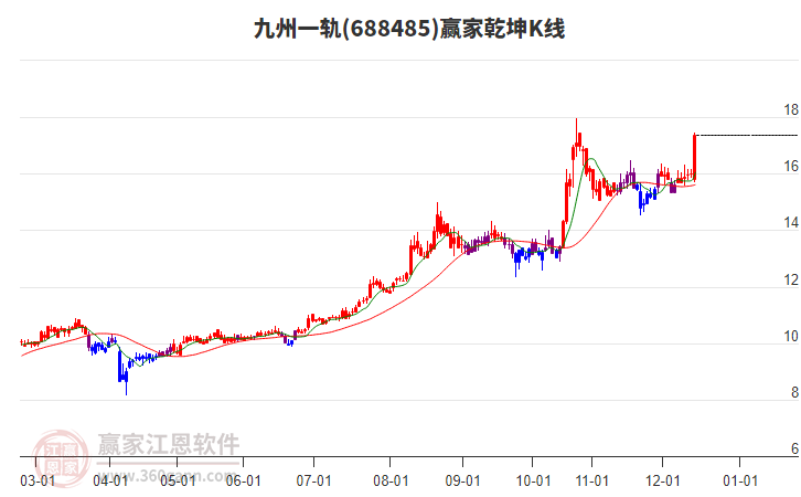 九州一軌688485今日低開收陽,收盤價為17.39,相較于昨日陽線收盤價16.0,上漲1.39元,漲幅8.69%,近兩日連收兩根陽線,近兩日呈現(xiàn)上漲趨勢,近10個交易日股價呈上漲走向,今日K線以穿頭