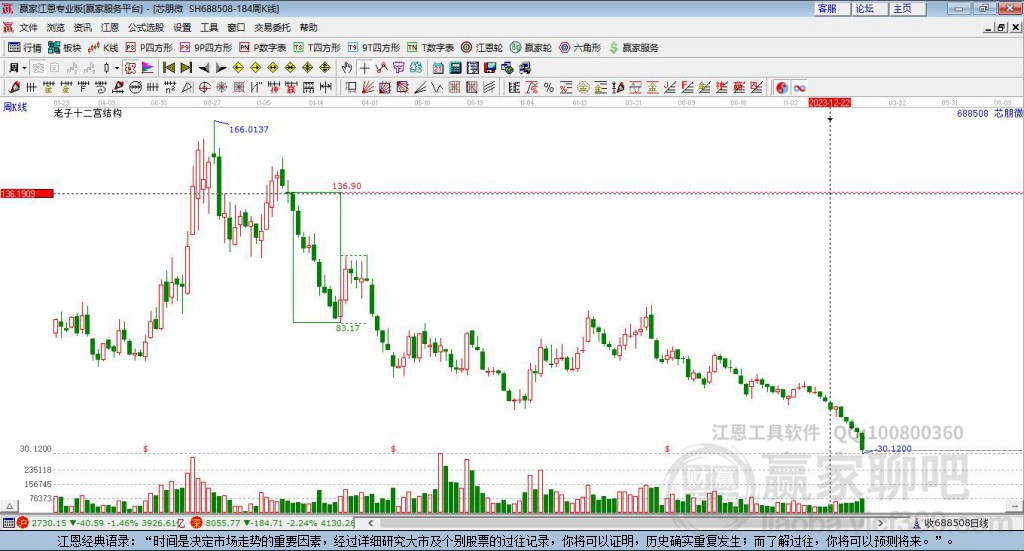芯朋微處于贏家江恩多頭次主線形態(tài),從12月9日形成頂分型后持續(xù)下跌,重心下移,今日跌破前低形成短期初次筑頂信號,短期多頭趨勢已被破壞,中期多頭趨勢延續(xù),但長期處于回調(diào)中。芯朋微今日跳空低開,截止目前K