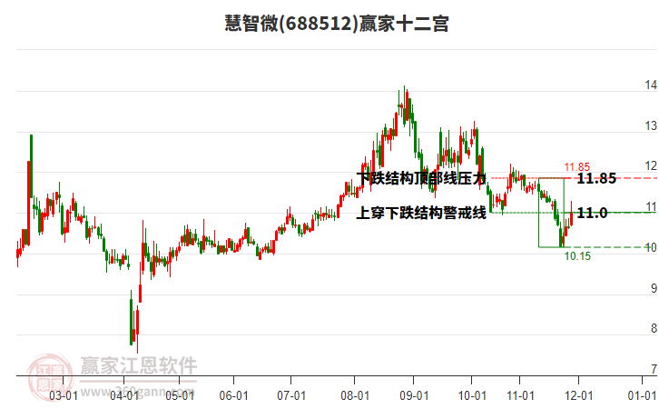 慧智微處于贏家江恩空頭主線形態(tài),12月8日發(fā)出江恩筑底信號后,經(jīng)過2日,今日形成短期筑頂信號,短期多頭趨勢已被破壞,中長線均在空頭下跌趨勢中?;壑俏⒔袢仗盏烷_,截止目前K線呈現(xiàn)上影小陰線,股價走弱。