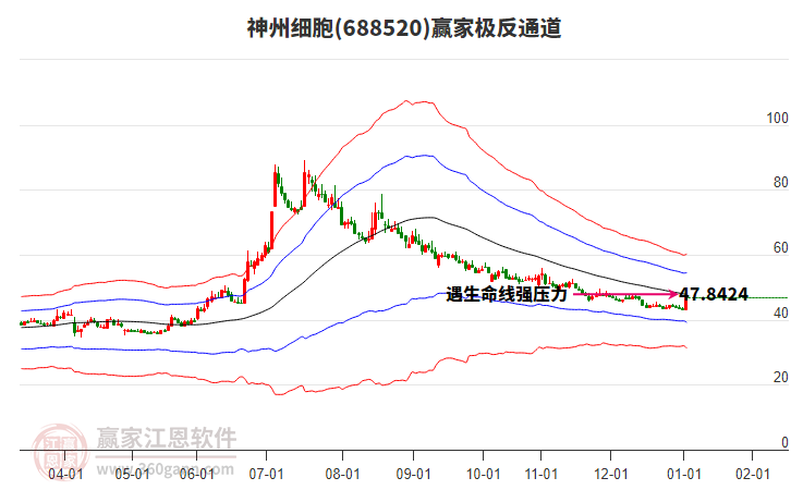依據(jù)贏家江恩系統(tǒng)趨勢(shì)工具極反通道分析判斷神州細(xì)胞688520運(yùn)行在生命線以下弱勢(shì)區(qū)域,根據(jù)規(guī)則該股短線輕倉(cāng)參與,股價(jià)跌至弱勢(shì)外軌線后波段再結(jié)合其它工具信號(hào)建倉(cāng)。應(yīng)用口訣是:生命線上強(qiáng)勢(shì)走,生命線下難抬頭;紅黃兩條外軌線,壓力支撐顯勢(shì)頭。