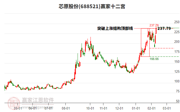 1月26日芯原股份688521最高價(jià)237.79上穿了贏家極反通道工具上方紅色外軌線,受到上方紅色外軌線強(qiáng)力壓制,最終收盤停留在在上方紅色外軌線與藍(lán)色外軌線上方的超強(qiáng)通道區(qū)域。芯原股份688521近1