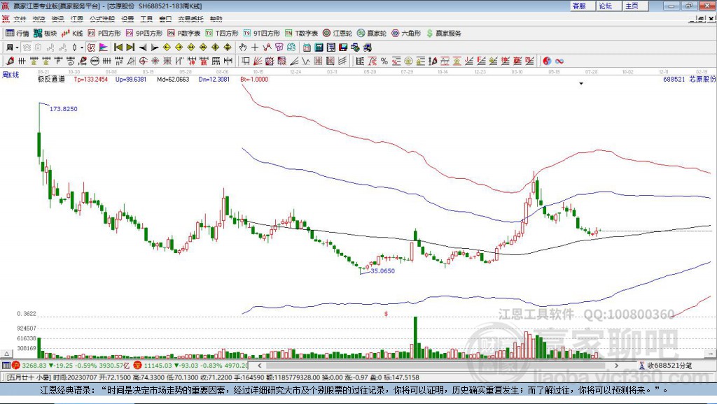依據(jù)贏家江恩極反通道趨勢工具展示,本周收盤價191.7,跌破強勢通道線211.4993,短期走弱,極反通道規(guī)則顯示,失守一線,看低一線,下方支撐關(guān)注生命線118.5671,如延續(xù)下跌趨勢,將向下尋找生命線支撐。