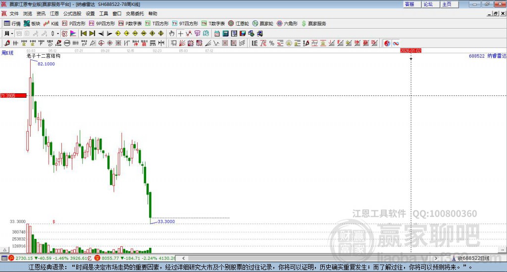 依據(jù)贏家十二宮結(jié)構(gòu)模型工具展示,本周股價(jià)處于2025年11月21日形成的下跌結(jié)構(gòu)底部線36.2上方區(qū)域,該股自近期高點(diǎn)48.05跌至本周41.45,跌幅15.92%。依據(jù)贏家十二宮多空能量守恒規(guī)則,若股價(jià)不能有效站穩(wěn)底部線,下方多空能量平衡位需結(jié)合前方贏家十二宮結(jié)構(gòu)尋找。