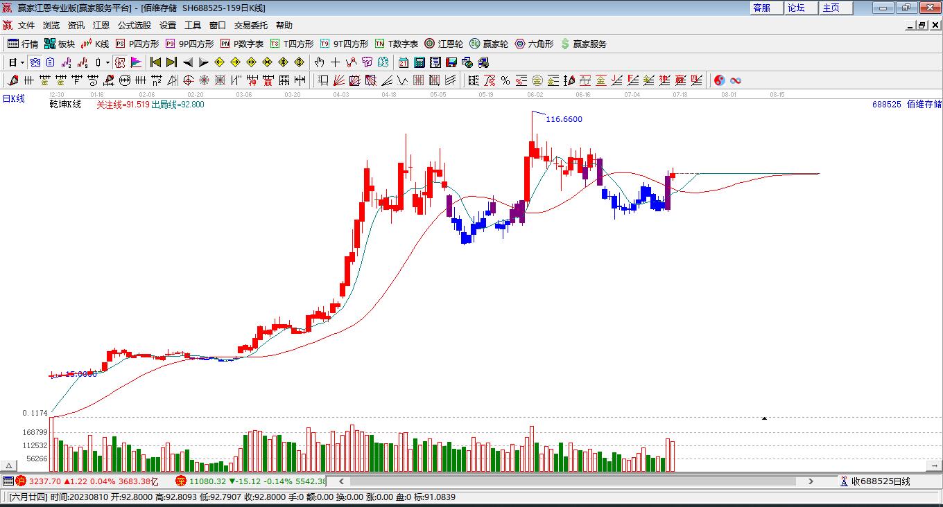 依據(jù)贏家江恩乾坤K線工具展示,本周K線以陽線收盤,目前K線處于紅色區(qū)域,位于關(guān)注線上方,依據(jù)贏家江恩乾坤K線多空模型,目前多頭出局線對當(dāng)前股價形成支撐,短期看多。后市如若股價跌破多頭出局線,則可能形成短期回調(diào)。