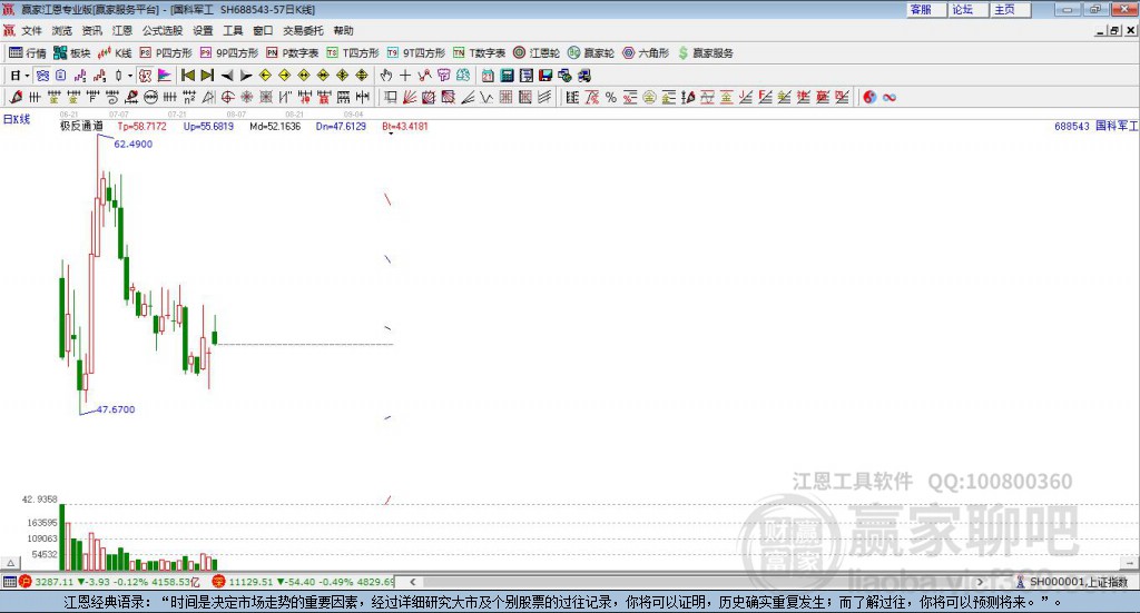 國(guó)科軍工(688543)處于贏家江恩多頭次主線形態(tài),12月8日發(fā)出江恩筑底信號(hào)后,經(jīng)過(guò)49日,今日形成短期筑頂信號(hào),短期多頭趨勢(shì)已被破壞,中長(zhǎng)期多頭趨勢(shì)依舊保持。國(guó)科軍工今日跳空低開,截止目前股價(jià)依然