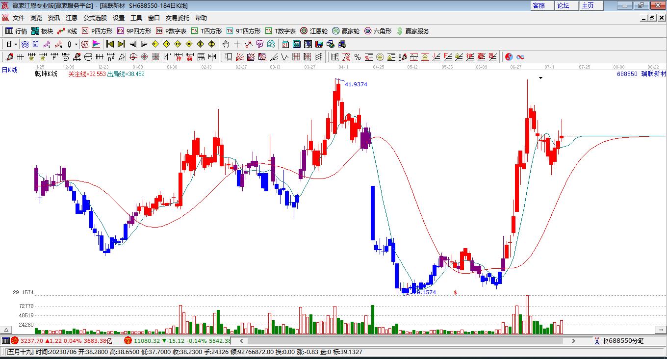 688550瑞聯(lián)新材處于贏家江恩多頭次主線形態(tài),今日形成短期筑頂信號,短期多頭趨勢已被破壞,中長期目前都處于回調(diào)中。瑞聯(lián)新材目前K線為光頭小陰線,且當(dāng)前股價低于昨日收盤價,股價走弱。