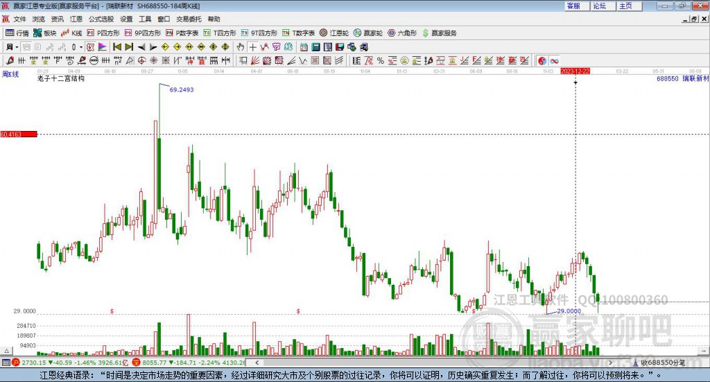 688550瑞聯(lián)新材處于贏家江恩多頭中期回調(diào)形態(tài),12月31日發(fā)出江恩筑底信號后,經(jīng)過44日,今日形成短期筑頂信號,短期多頭趨勢已被破壞,中長線均在空頭下跌趨勢中。瑞聯(lián)新材今日低開,截止目前股價高于昨