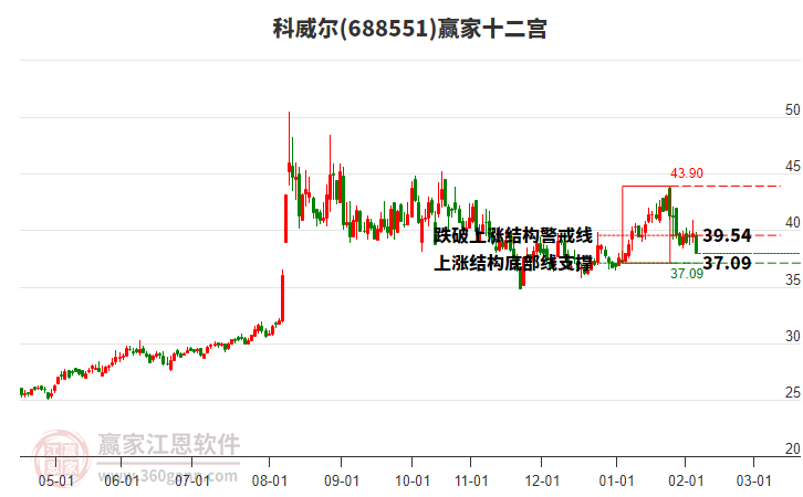 周三科威爾最高價(jià)39.8上穿了贏家極反通道工具生命線,受到生命線強(qiáng)力壓制,最終收盤停留在在生命線與藍(lán)色下軌線上方的弱勢通道區(qū)域??仆柦?0個(gè)交易日漲幅2.27%。